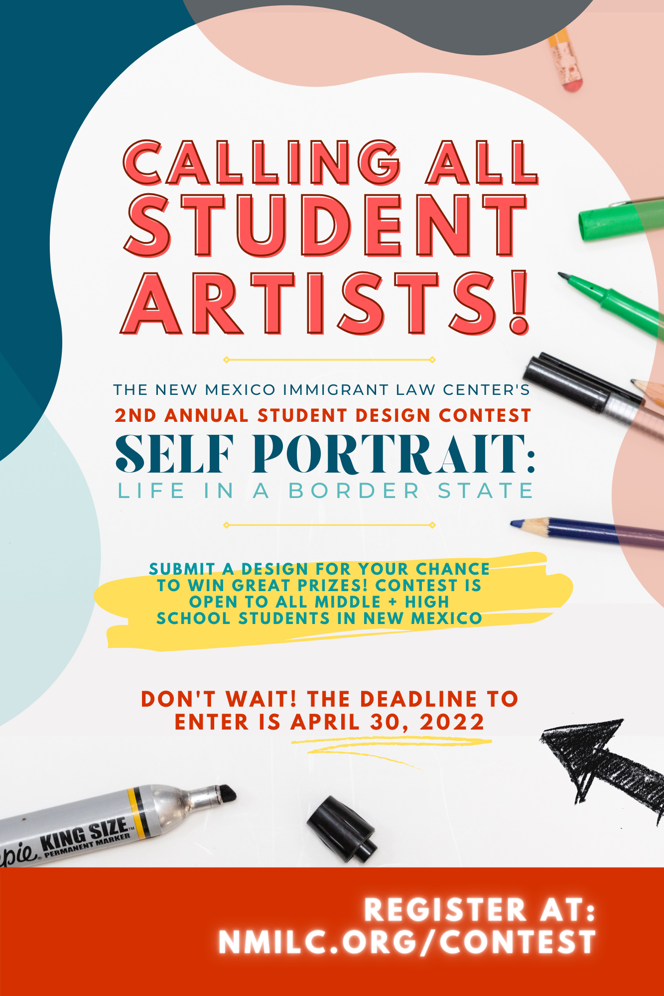 At NMILC, we are dedicated to reclaiming the narrative and conversation around immigration and our border communities by creating lasting cultural change through “artivism,” storytelling and advocacy. Last year, we tried something entirely new: a design contest for middle and high school students across New Mexico. In the middle of a pandemic, we gave students a prompt, a deadline, and the opportunity to win prizes…and the results blew us away! We are thrilled to announce that the NMILC Design Contest is back for a second year! This year’s theme is: Self Portrait: Life in a Border State